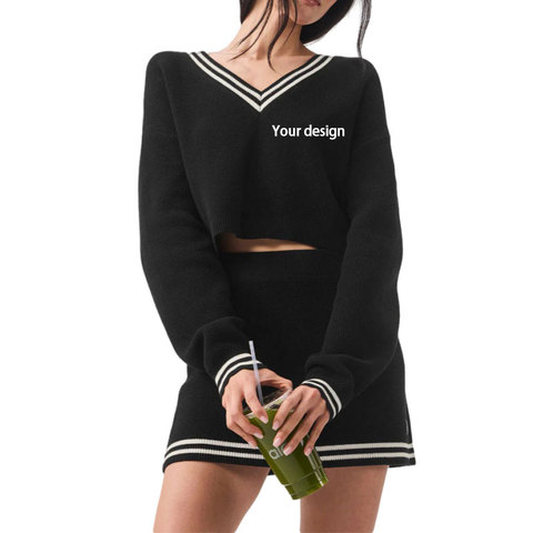Großhandel Custom Logo Baumwoll mischung Frauen Strick pullover Röcke V-Ausschnitt Pullover Einfarbig Sport Tennis Strickwaren 2 Stück Set OEM